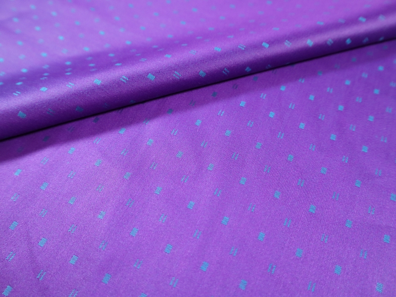 This elegant shirting fabric features a geometric dobby pattern, iridescent yarns, and a sateen finish.