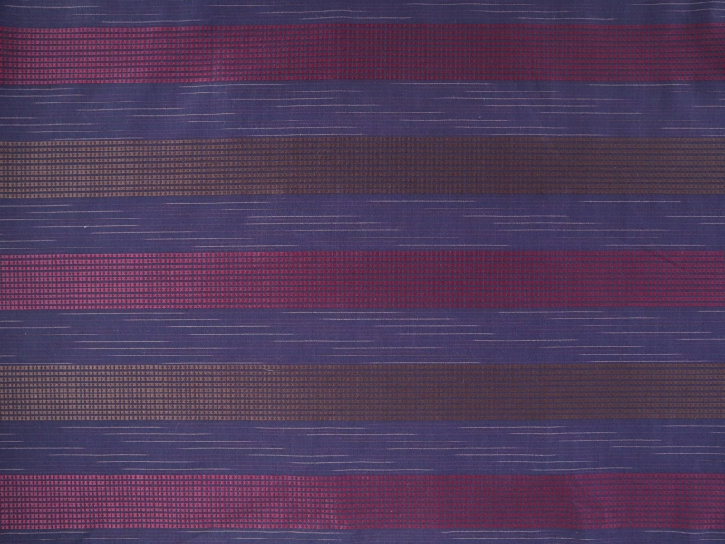 Fine cotton shirting with a 1960s vibe, fine hairline striped with an alternating diamond dobby pattern in copper and ruby red on a navy back.