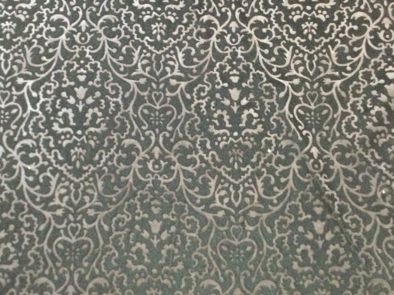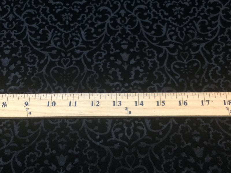 Embossed with a pattern that covers 52" of the fabric with 8" of plain velvet.(4" on each selvage)