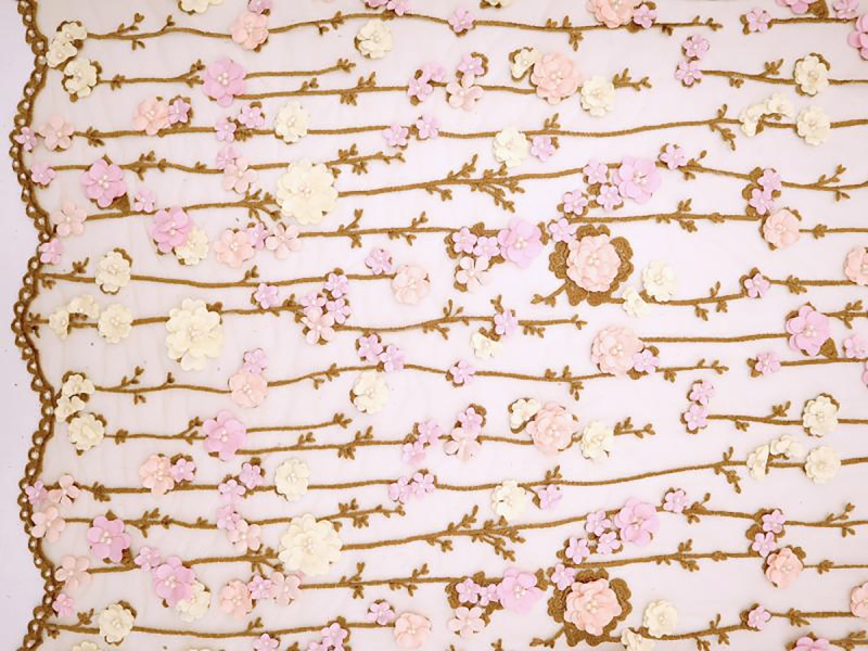 Embroidered Illusion with Floral Appliques in Brown and Pink