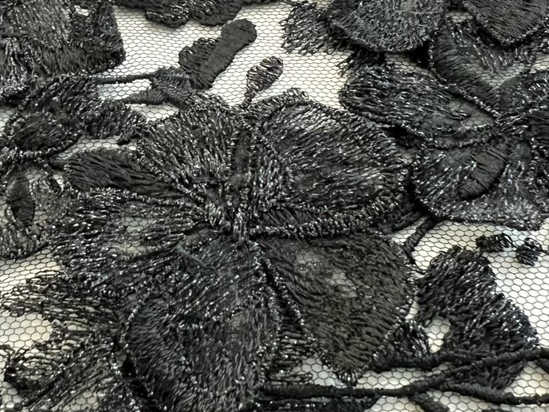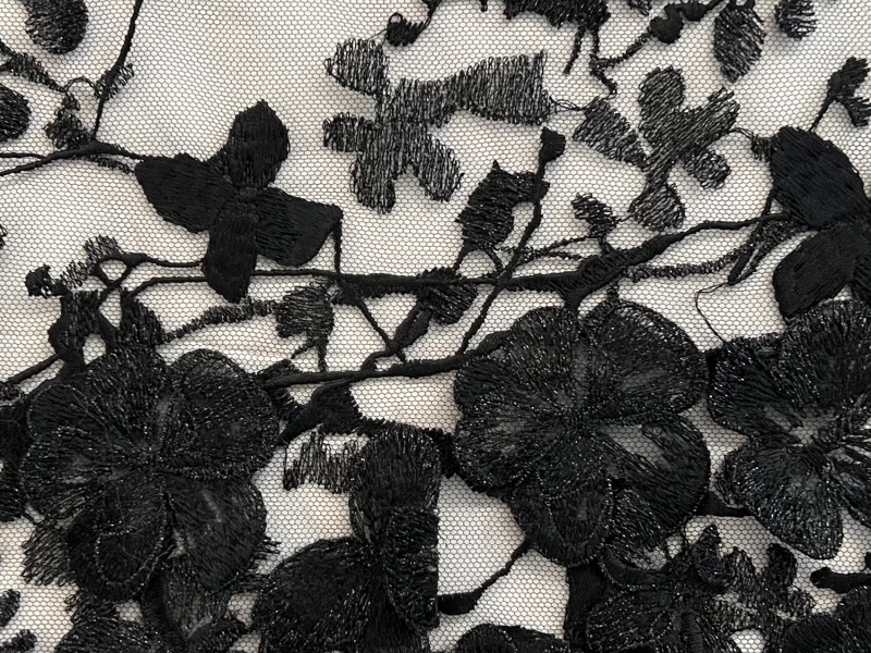 Embroidered Tulle with 3 D Flowers Appliqué in Black