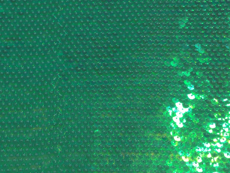 Lustrous sequins sewn onto a stretchy and tightly knitted tulle fabric, ideal for body contouring designs. These sequins are meticulously sewn in place and lay very flat on their fabric base, with a slight overlap that makes them appear like fish scales.