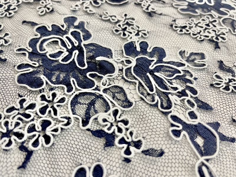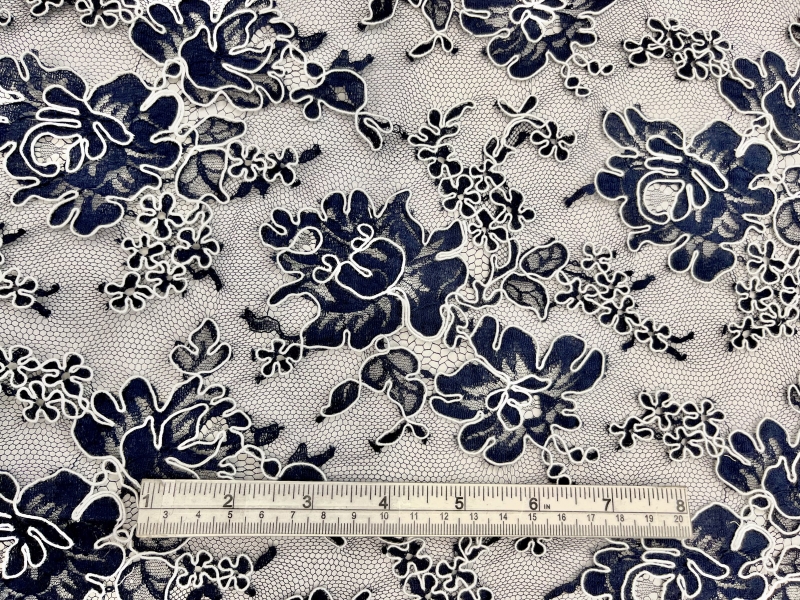 Navy Blue Alençon Lace with Roses Outlined by White Cordings.