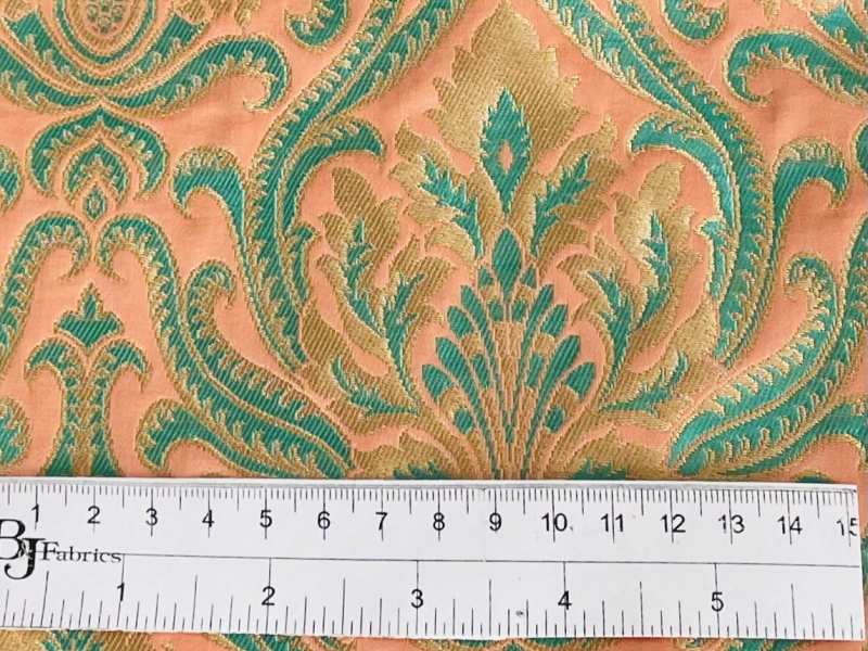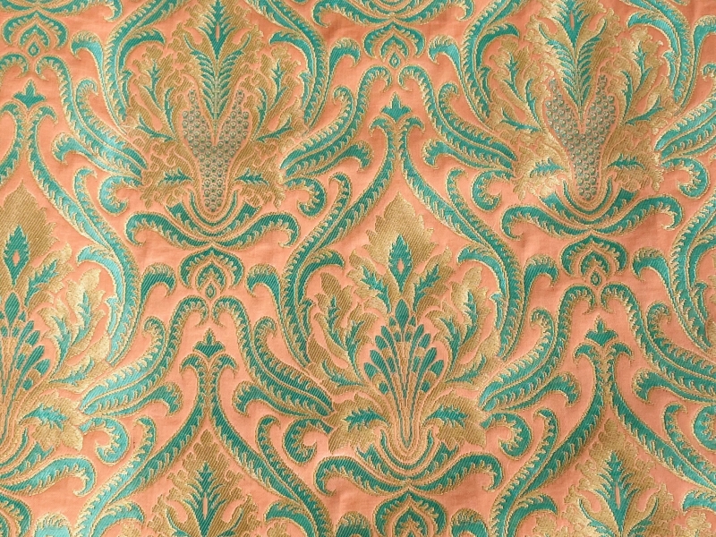 Metallic Brocade in Salmon Ground with Light Turquoise and Gold Baroque Design