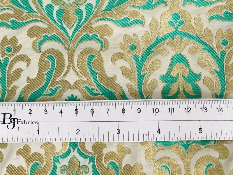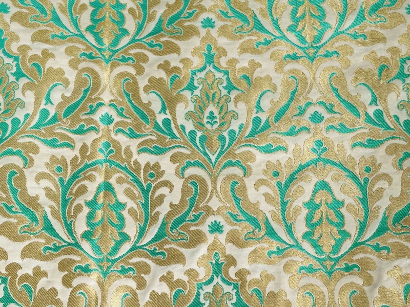 Metallic Brocade in Off-White Ground with Green and Gold Baroque Design