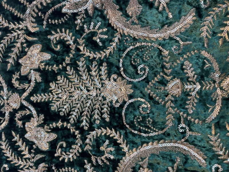 METALLIC EMBROIDERED<BR>SEQUINED<BR>VELVET <BR>IN GREEN/GOLD<BR>
