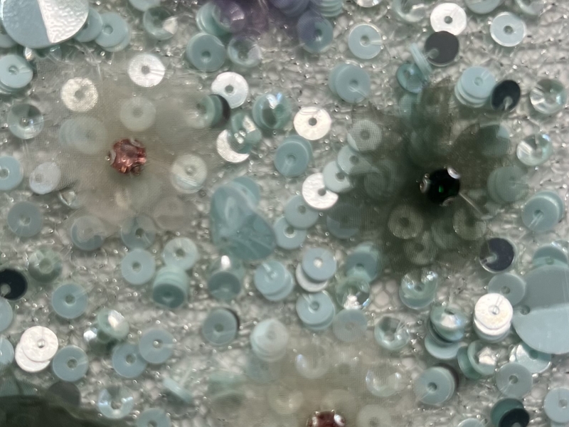 Metallic Novelty Silver Net with Hand Sewn Sequin & Paillettes and Laser Cut Sage, Lavender & Pink Flowers.