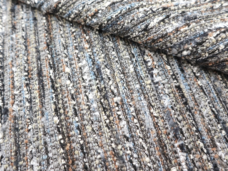 This Metallic Tweed is loosely woven and light-weight, with a mix of both natural and synthetic fibers that give it it's appealing texture and accents of metallic lurex. Turn this fabric into an iconic Chanel-type jacket, a suit, a simple dress, or even a skirt.