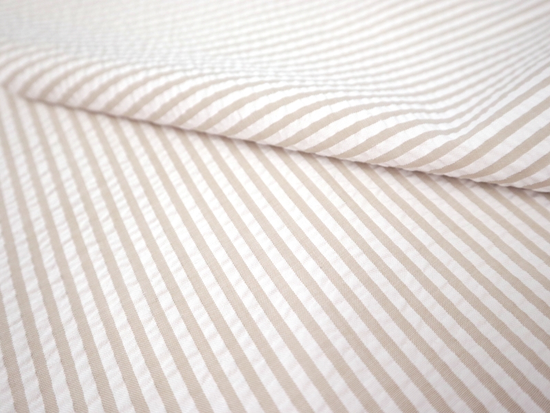 Poly Cotton Blend Seersucker is lightweight, comfortable, and ideal for Summer apparel. Seersucker is woven in such a way that bunched threads cause the fabric to rise off of the surface. This ‘wrinkled’ appearance promotes breathability; this fabric requires no ironing.