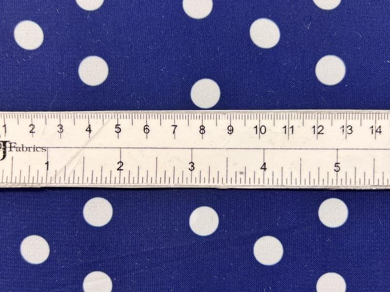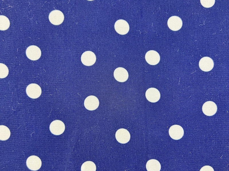 PRINTED POLYESTER<BR>NAVY WITH WHITE DOTS<BR>FABRIC IN WAREHOUSE