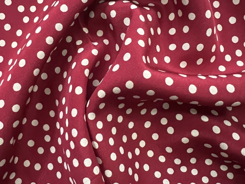 100% PRIINTED SILK <BR>CREPE DE CHINE<BR>WINE & WHITE DOTS