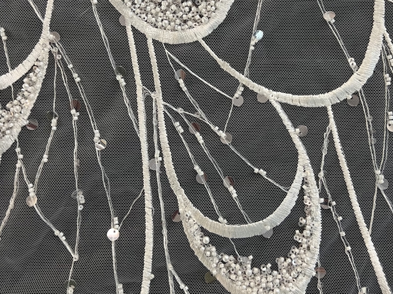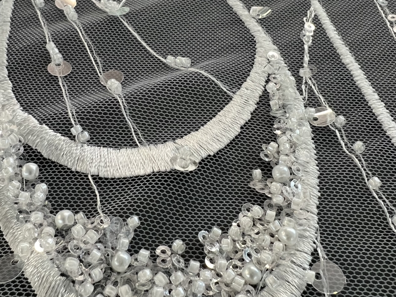 Satin Stitch Embroidered Tulle with Beads & Paillette in Clear and White