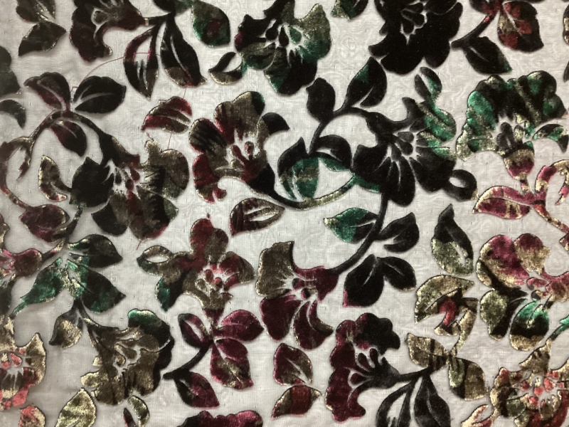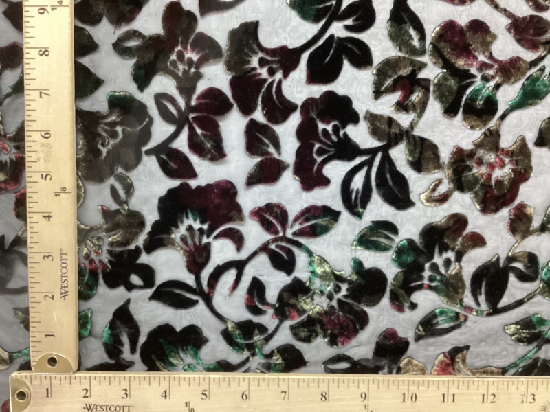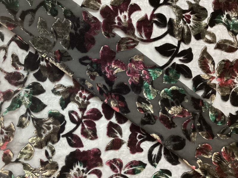 Silk & Rayon Multi Jewel Tone Burn Out Velvet On Black Silk Chiffon