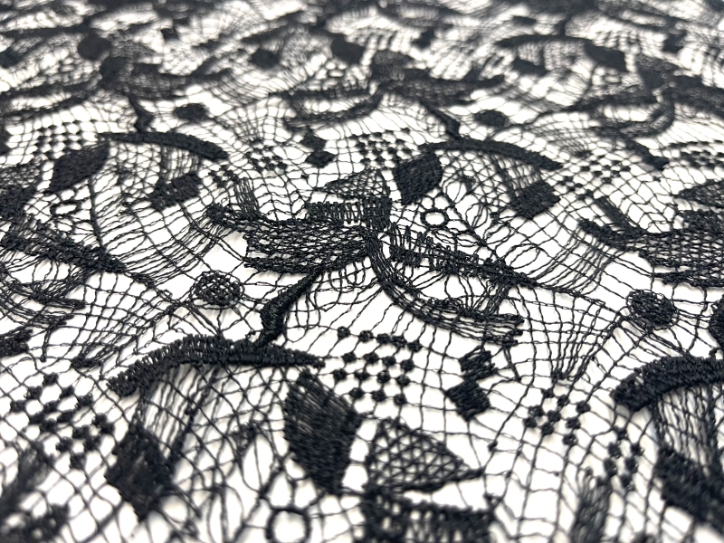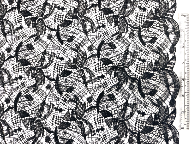 Single Scalloped Black Embroidered Lace in Artisan Brush Stroke Pattern