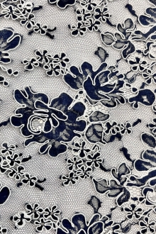 French Navy Blue Alençon Lace with Roses Outlined by White Cordings.